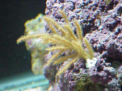Sony Mavica FD91 digital camera, no flash. Pictured left is a cutting off my main colony. I just snip off a branch, insert it into a small hole and use marine epoxy (white) to hold it in place. I have made many cuttings of the gorgonian and given them to fellow reefers. The cutting in this picture is about 5 inches tall. |