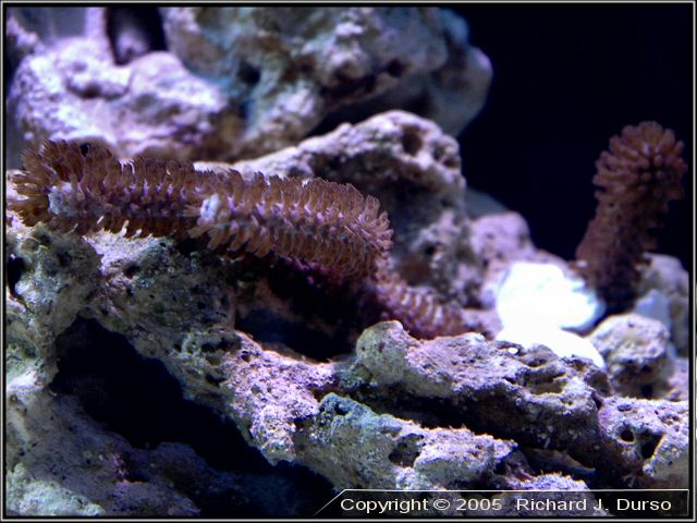 Picture was taken in December 1999 with a Nikon Coolpix 950 Digital Camera, No Flash Added to tank on October 11, 1999, given to me by Jim Fox (aka MiNdErAsR) making me a 3rd generation owner of this coral. These are just beautiful with long flowing polyps that sway in the currents. This picture does nothing to show how nice this soft coral looks. There are three main colonies attached to the rock, the one in the middle is fairly small. The colonies are about 10 inches tall and 15 inches long. |