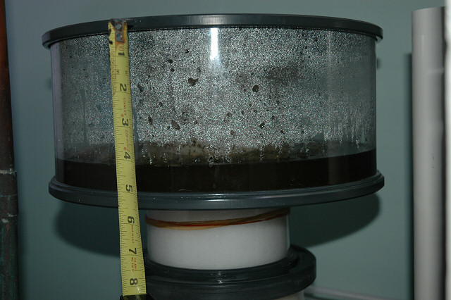 This is the skimmate collected in the first 24 hours of running. This is a considerable amount of dark skimmate. I added some rubber bands around the neck of the skimmer to get a better grip on it to remove the collection cup. |