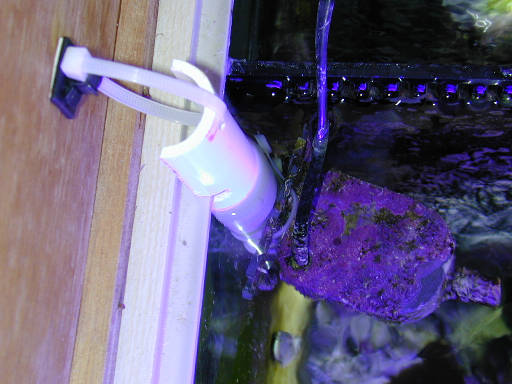 This shows the Maxijet 1000 powerhead attached to the acrylic hanger with plastic wire ties. You should get a nice snug fit and the powerhead should not slide when the power is turned on. If the hanger is to lose adjust the angle of the back part of the hanger to point inwards. This will apply pressure to the tank wall and keep the powerhead in place. If that does not solve the problem, try wedging a piece of soft foam between the back part of the hanger and the tank wall. |